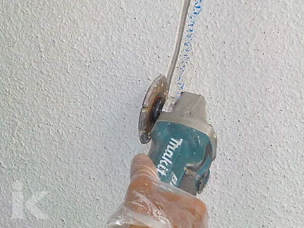 クラックに沿って、サンダーでU字に削ります。カットすることによって補修材を十分に注入させる事が出来ます。