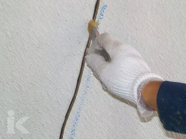 カットしたクラック部分の塵やほこりを取り除き、プライマーを塗布致します。プライマーとは上塗り用の塗料と下地材の密着性を高める接着剤としての役割があります。