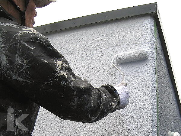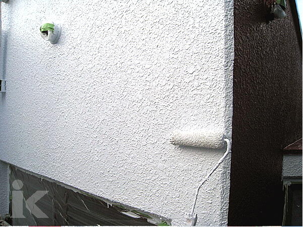 下地処理(コーキング、パテ、場合によっては注入等の処理)が終わったら養生を行い、中塗り・上塗りの密着をよくするために下塗り材を塗装します。