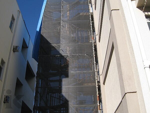 ケレン作業時のゴミ及び塗装時の塗料等が飛散しないように、足場を組立ててシートで養生を行います。当社は、作業の安全性・近隣への配慮を常に忘れない施工を心がけております。