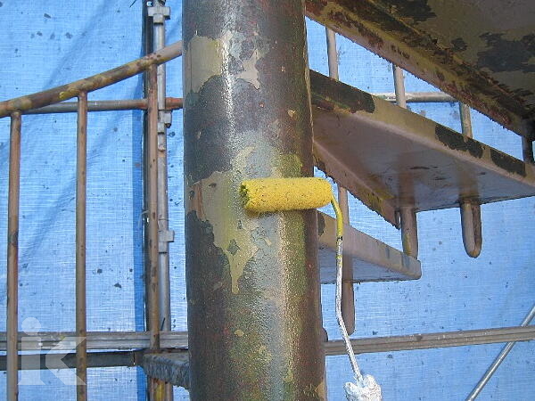 2液エポキシ樹脂錆止めが乾燥したら、2液形ウレタン塗料で中塗りを行っています。このウレタン塗料は高い耐候性を持ち優れた低汚染性を有しています。