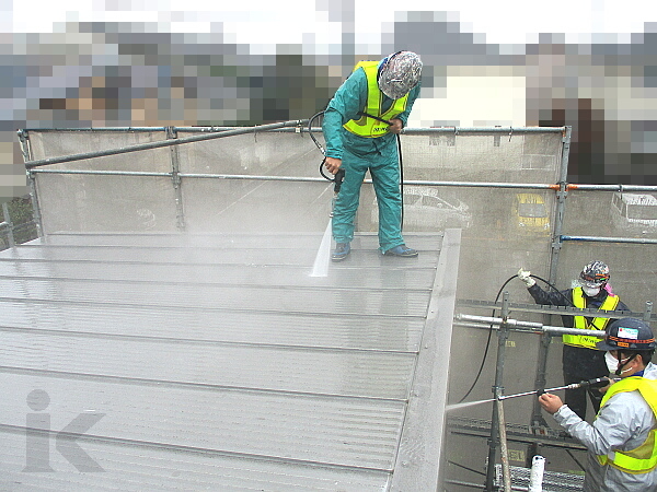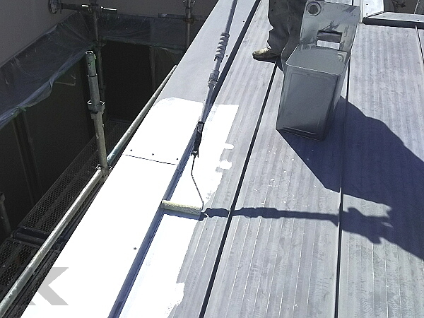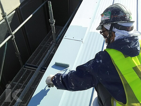 仕上げに同じく遮熱用シリコン塗料で仕上げ塗りを行います。下塗りに遮熱用プライマー、中塗り、仕上げ塗りに遮熱用シリコン塗料を使用することで、屋根表面温度を下げ、建物内の温度を低減させる効果があります。